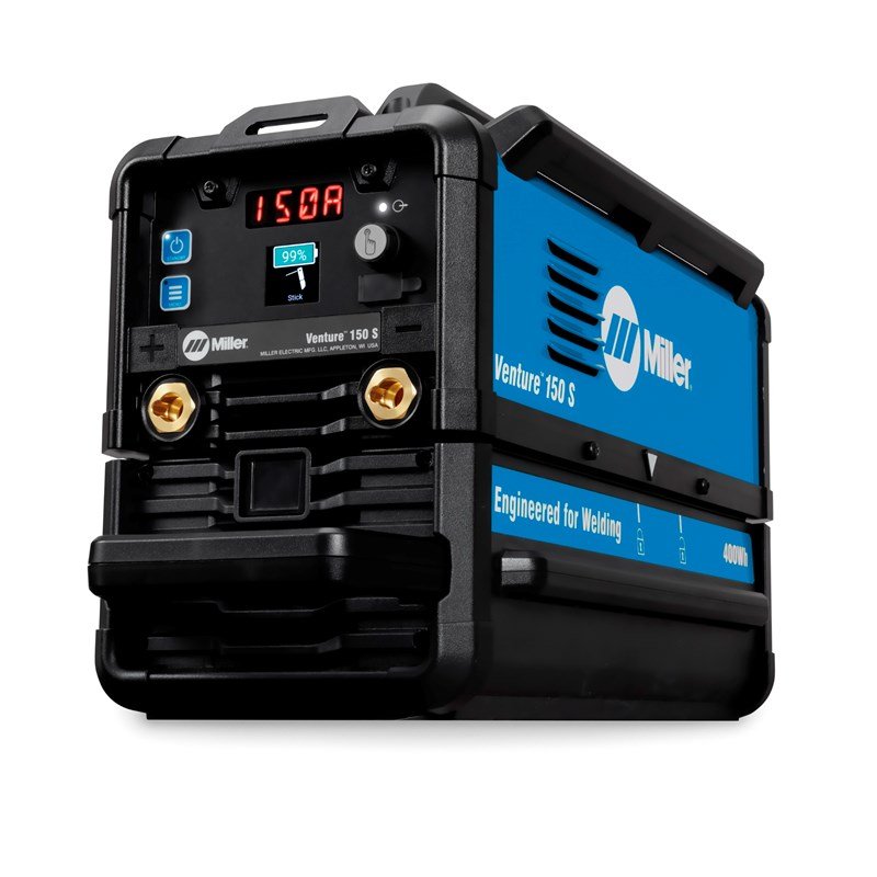 The Miller Venture™150 S is a rugged, lightweight Stick/TIG welder engineered for welders on the move. Weighing just 27 pounds (with battery) and equipped with a convenient handle and shoulder strap, it’s ideal for mobile welding, jobsite work, maintenance, and repair.